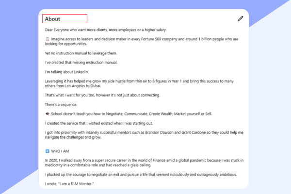 This write-up is also a goldmine to include keywords relevant to your services that have the potential to show up on search results on search queries on LinkedIn. But no keyword stuffing here, meaning a long string of words instead of including them in well-written sentences. Those tactics look spammy and out of date, not the type of impression you want to leave with a potential client.