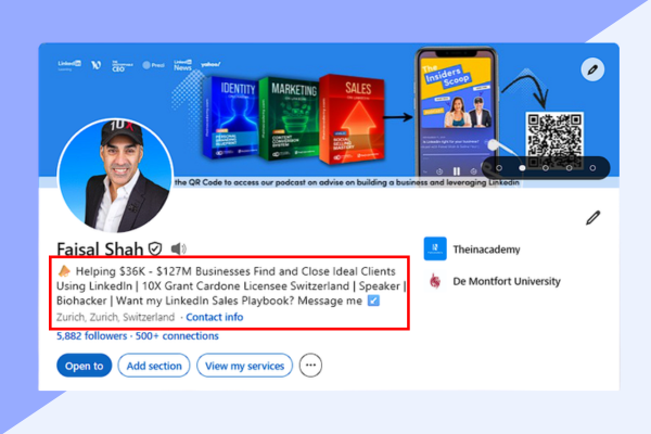 Your LinkedIn headline is one of the most critical components to your overall LinkedIn profile. It’s placed right underneath your profile picture. Think of it as your three-second handshake to possible clients and potential business opportunities.